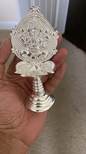 Handcrafted for spiritual significance and aesthetic beauty, this traditional oil lamp features Lord Ganesha, the remover of obstacles. German silver, known for its durability and elegant shine, makes this a timeless addition to your puja rituals or home decor.
