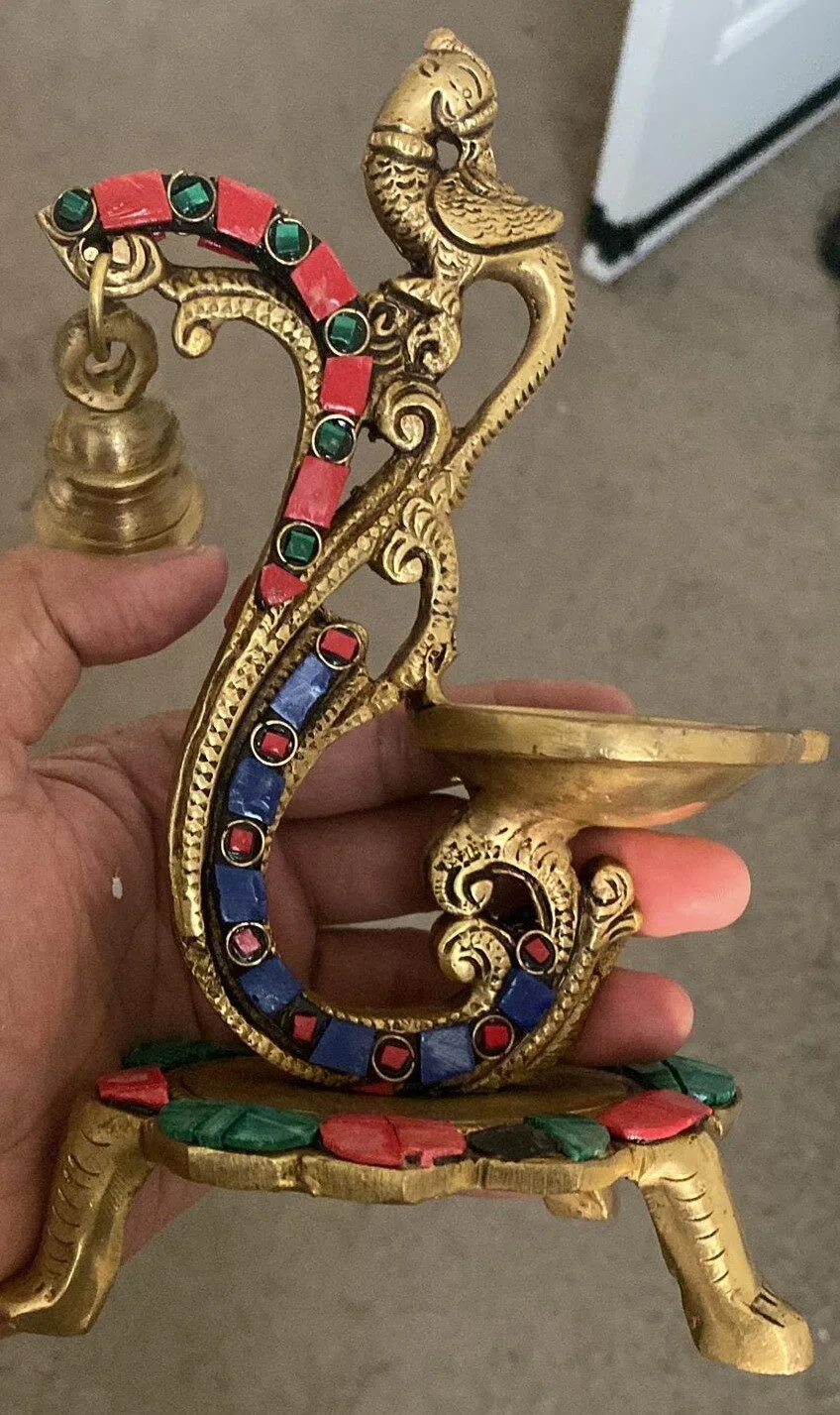 This 8″ Brass Decorative Diya with Bell and Stone Work is a masterfully crafted ritual lamp that blends devotional tradition with ornamental elegance. Fashioned from solid brass, it features hand-applied stone embellishments and delicately attached bells that chime softly with every movement, creating an immersive spiritual atmosphere in your home or prayer space.