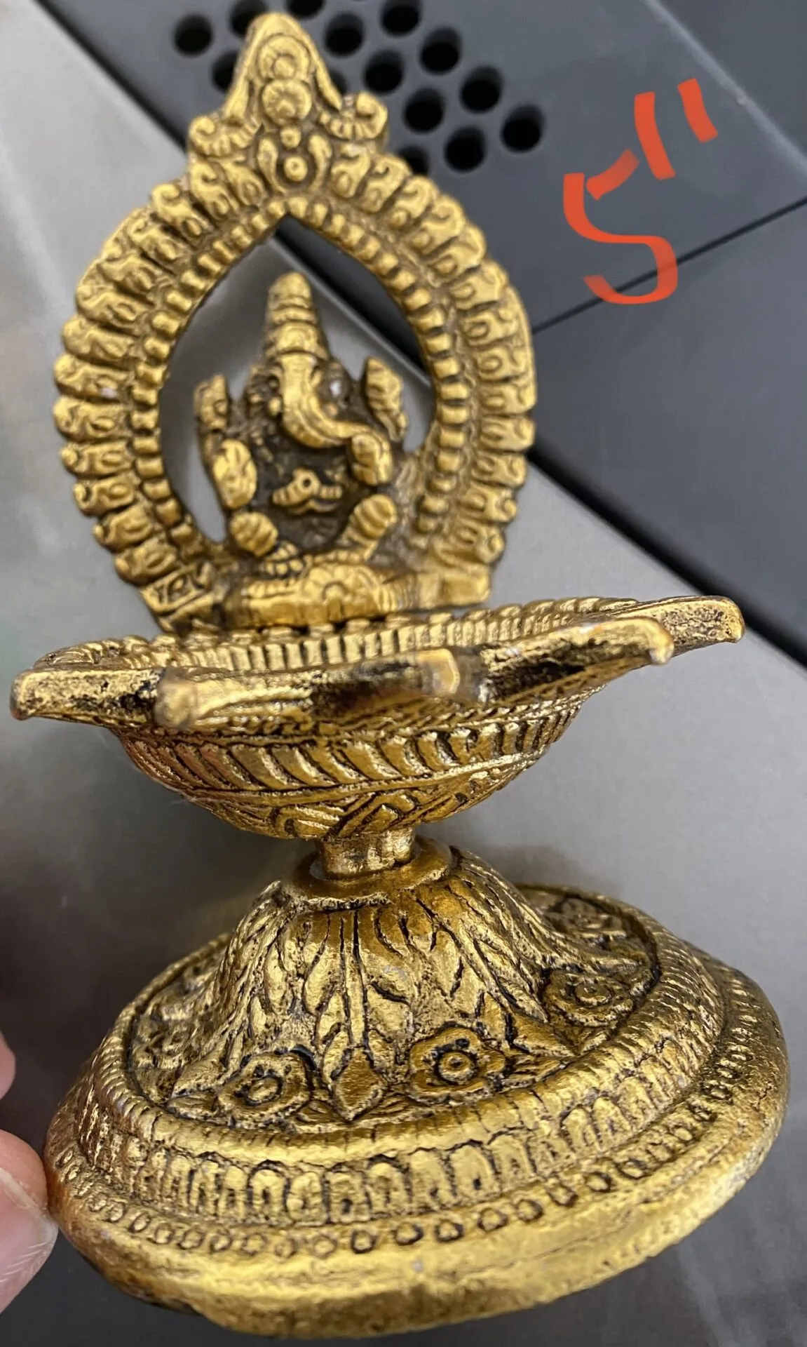 Brass Ganesha diya with antique look 5" height and very sturdy built. Apt choice for a return gift for various occassions.