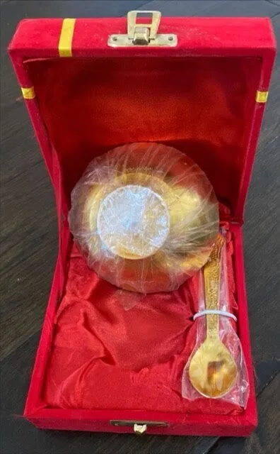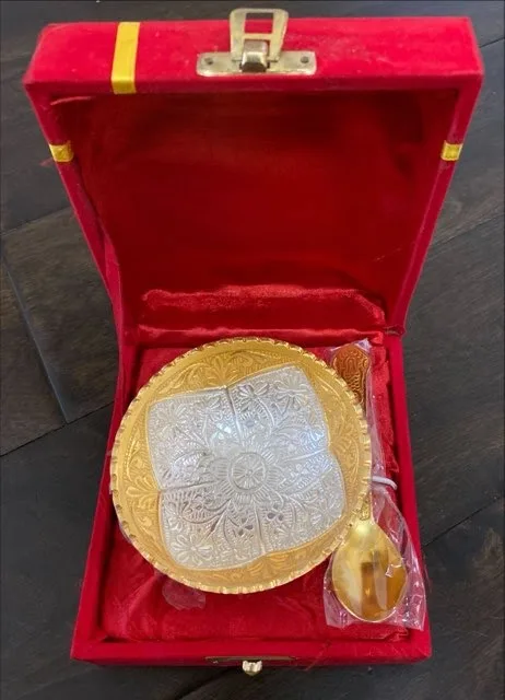 4″ Decorative Brass Bowl, silver and gold plated with spoon.